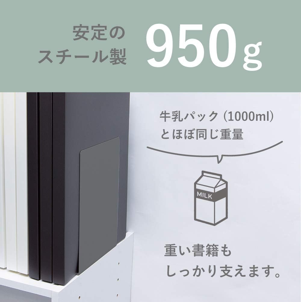 - ブックエンドの底面には、滑り止め用ゴムが付加されているので、重量のある本やファイル、厚みのある資料なども横滑りすることなく支えることができます。