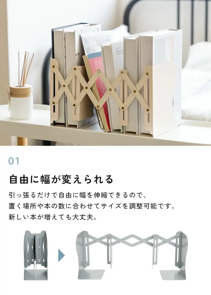 「本の厚みに合わせ幅を調節伸縮できるブックエンド」をお探しなら、「伸縮式 ブックスタンド」がオススメですね。