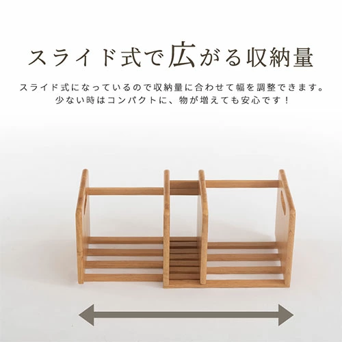 「スライド式で広がる収納量のブックスタンド」をお探しなら、「木製スライド式 ブックスタンド」がオススメですね。
