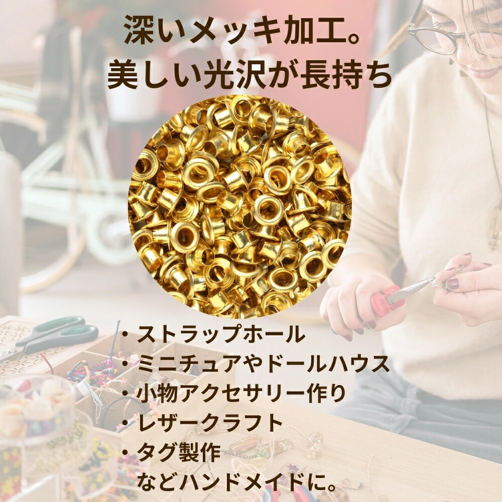 - ハトメサイズ:あしの長さ:4mm 内径3mm 外径6mm 素材:真鍮+金属メッキ仕上げ