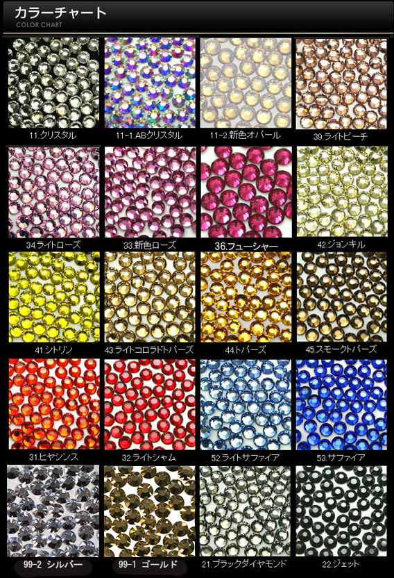 - カラーはクリスタル、アメジスト、ローズなど33種類あります。