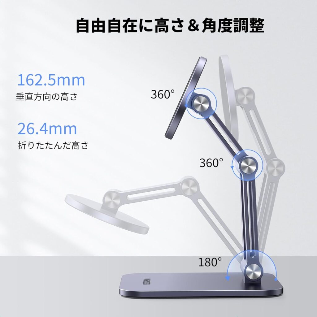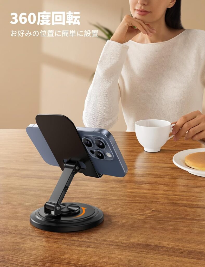 360度回転するスマホスタンドをお探しなら、「Lamicall 軽量折り畳みスマホスタンド」がオススメですね。