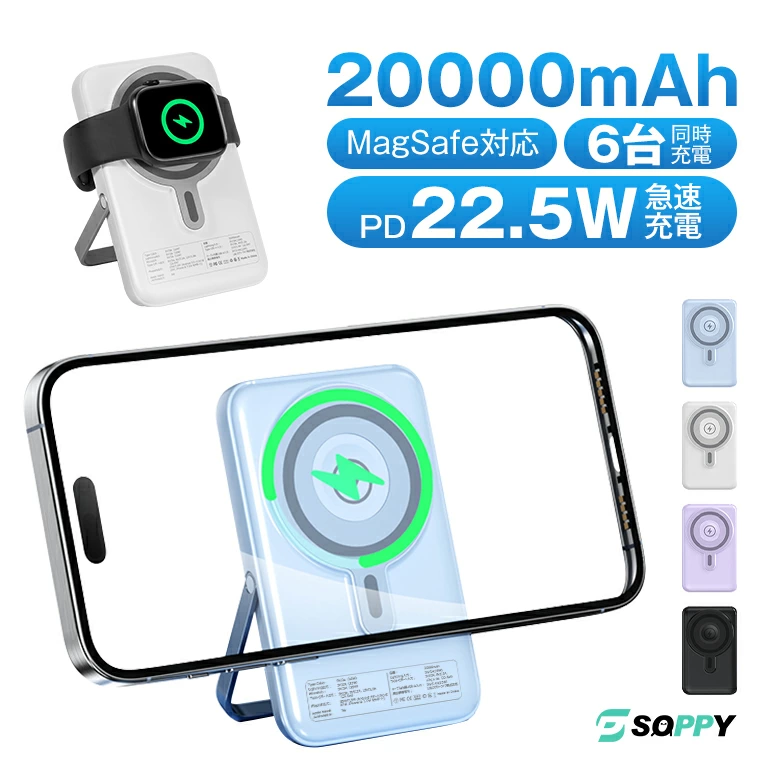 SOPPY スマホスタンド付きモバイルバッテリー | ★4.32(492件) | 11×7×2.1cm | ・20000mAh大容量バッテリー ・MagSafeワイヤレス充電対応 ・収納式スタンド内蔵で動画視聴に便利 | 楽天市場/送料無料 |
