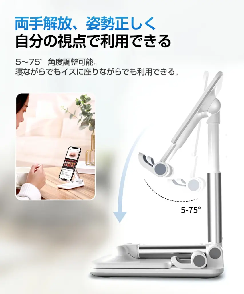 - 高さや角度を自由に調整できるスマホスタンド。