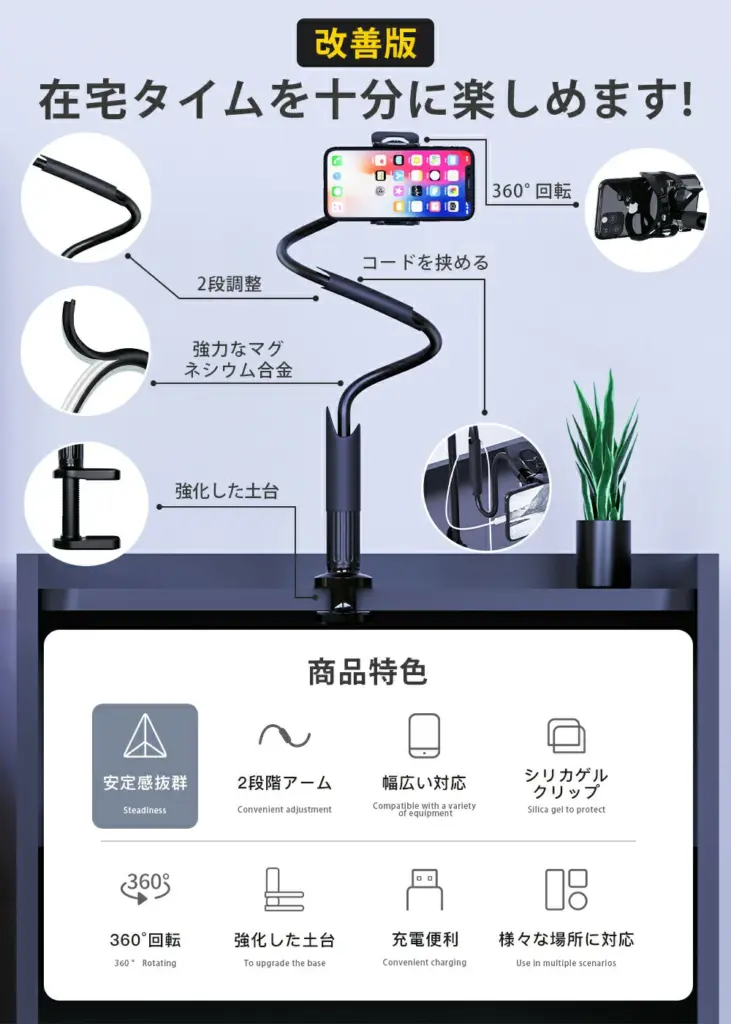 - 広いスタンドベース設計でぐらつきを軽減、クリップ式のスマホホルダーでスマホのずれや落下も防止します。