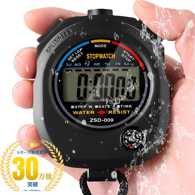 コンパクトサイズで、ラップ計測、アラーム、時計の機能付き!