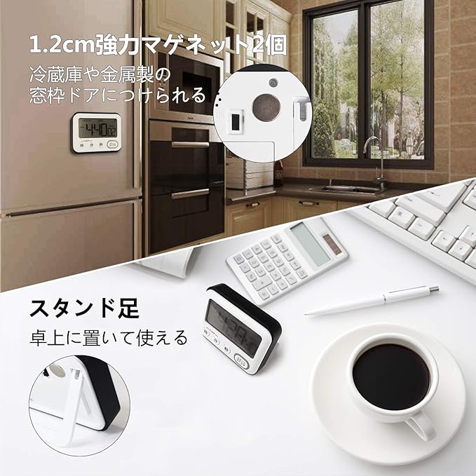 - 【さまざま機能】:アラーム機能、クロック機能(12/24時間表示切替)、タイマー機能(カウントアップ/カウントダウン)、4キー、トーンがあり、フラッシュが付きます、本体裏マグネット付き、置き掛け兼用(自立スタンド内蔵)。