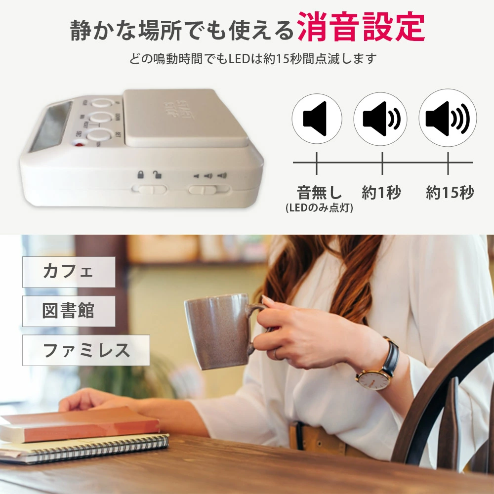 - ・操作音のON/OFFを切り替えられるので、カフェや図書館、オフィスのような音の出せない場所でも気にせず使用できます。勉強や仕事の時間管理など様々な用途に役立ちます。
