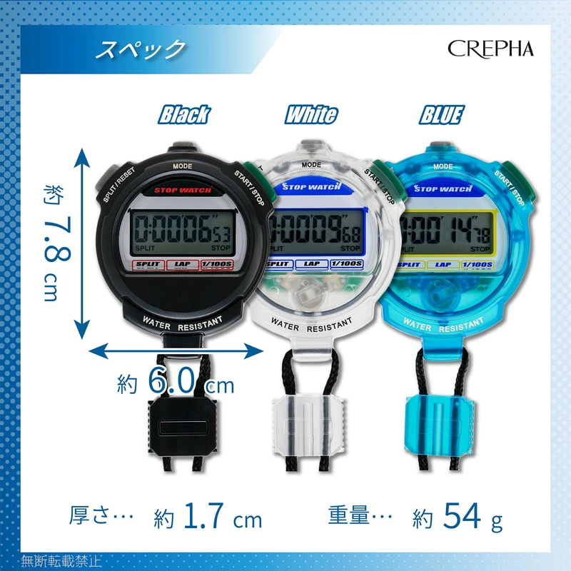 - ・サイズ:約W58×D21×H83㎜ 機能:1/100秒計測、ラップタイム、スプリットタイム、タイマー、アラーム、カウント、100メモリー、カレンダー 付属品:ストラップ(約60㎝)