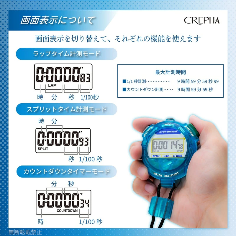 - ストップウオッチ機能 スプリット計測 最大100時間計測