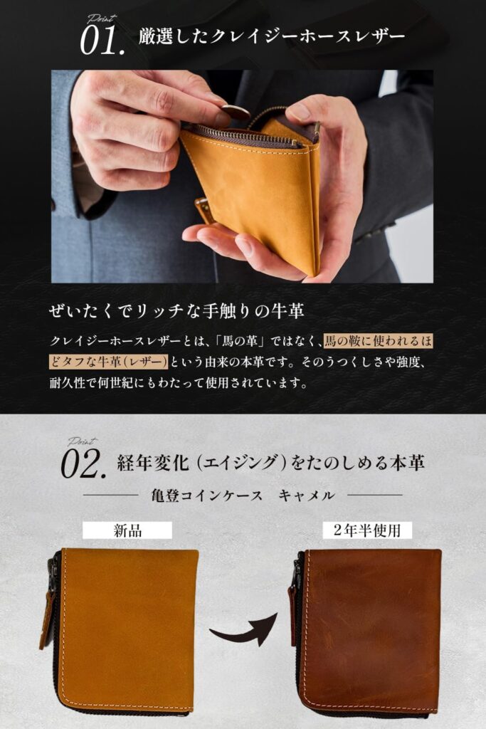 - 経年し牛革の表面が摩耗することで、革の色調が変わり、革表面に豊かで多彩な光沢が生まれ、自分だけの味のある財布になります。