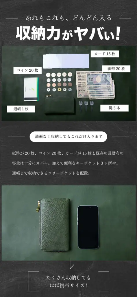 - お札20枚、小銭15枚、カード12枚が入ります。