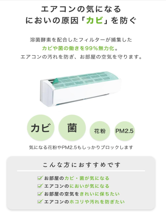 スターフィルター エアコンフィルター★3.9(1,581件/Amazon)約80×38cm溶菌酵素配合/捕集したカビ・菌・ウイルスを99%無力化と紹介Amazon1,590円無料