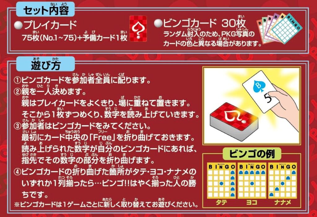 - セット内容:プレイカード75枚、ビンゴカード30枚入