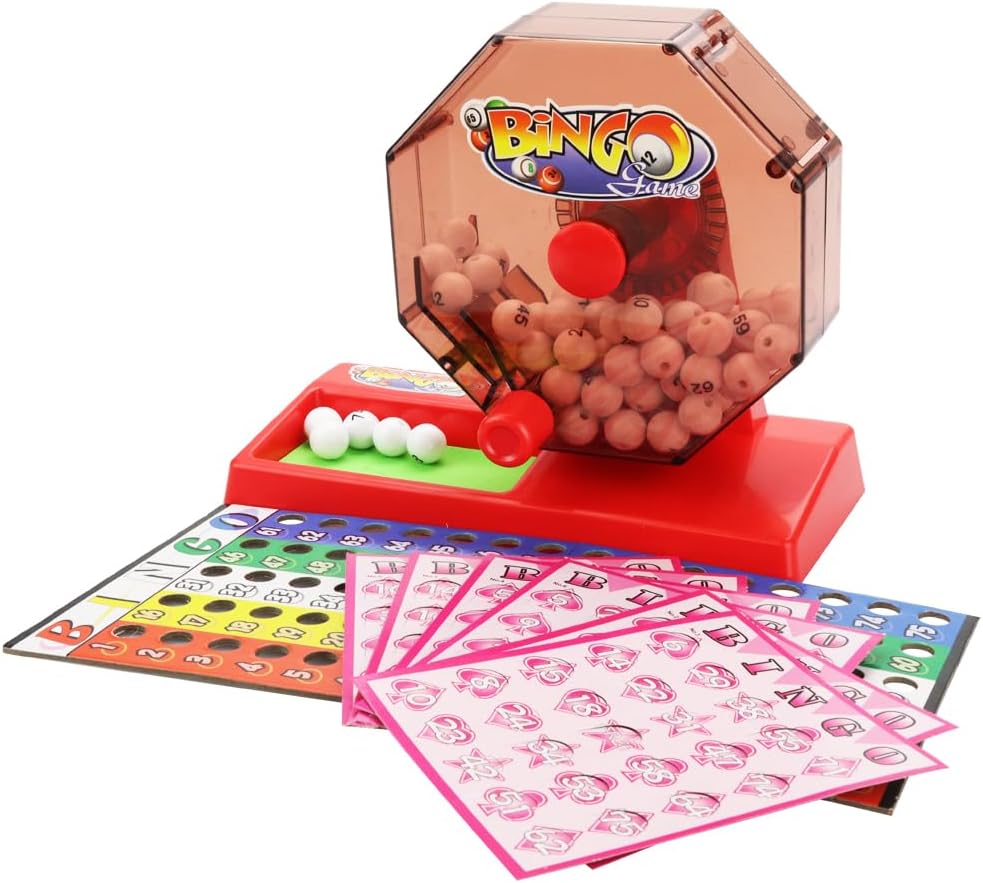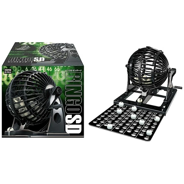 - セット内容:ビンゴマシーン×1点、番号付きボール×1~75(予備5個)、ボールトレイ×1点、ビンゴカード×6枚