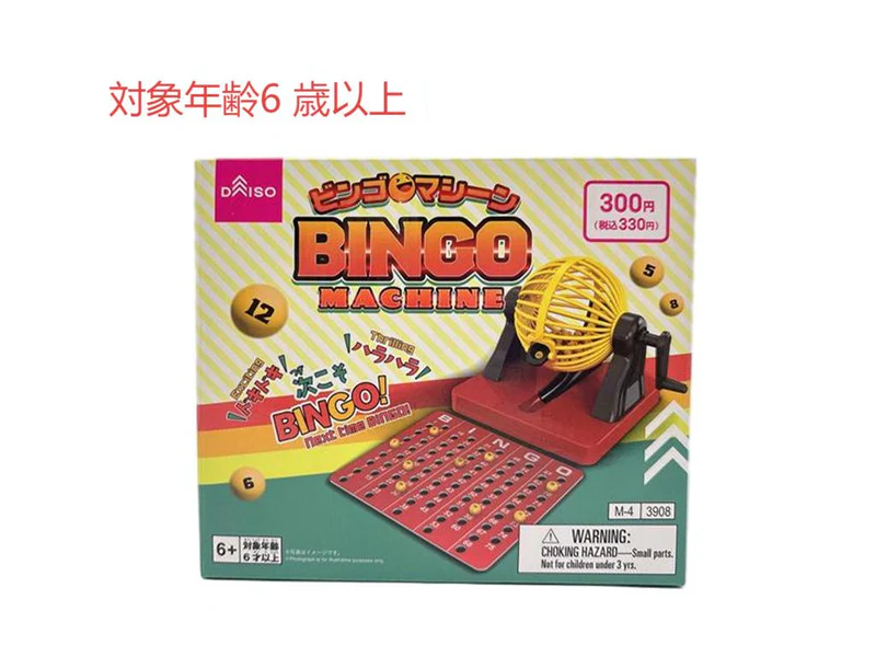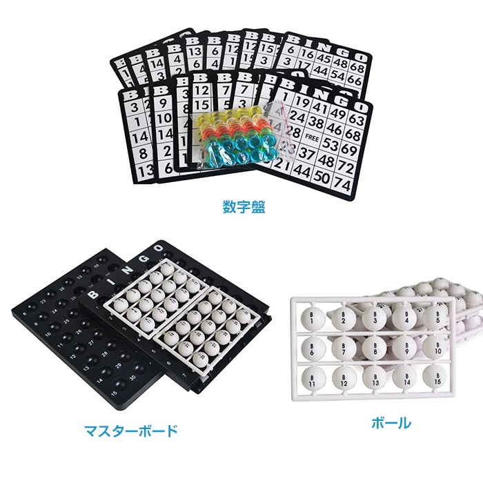 - セット内容:ビンゴマシーン、数字盤、ボール、マスターボード(出たボールを管理するボード)