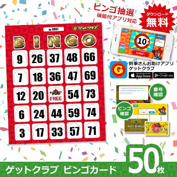 「無料ビンゴマシーンアプリと連動するビンゴカード」をお探しなら、「ゲットクラブ ビンゴカード」がオススメですね。
