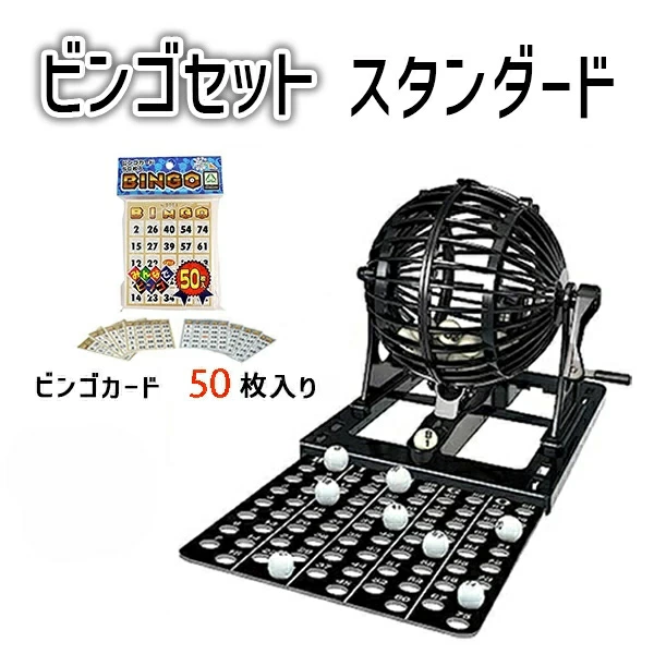 - セット内容:ビンゴマシン1台、ビンゴボール75個+1個、マスターボード(収納式)1枚、ビンゴカード50枚
