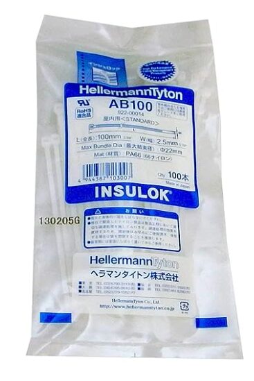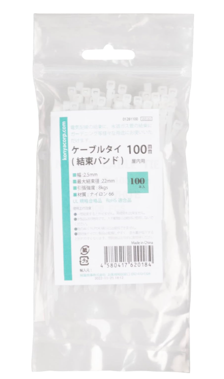 - サイズ は100×幅2.5㎜で、最大結束径 は22㎜です。