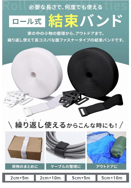 | AP LAB マジックテープバンド | ★4.6(26件) | 2 cm×5 m 2 cm×10 m 5 cm×5 m 5 cm×10 m 等 | 強力面ファスナーで安定固定/自由にカット可/専用バックル付き/繰り返し使用可 | Amazon:1,950 円~3,510円 (送料無料) |