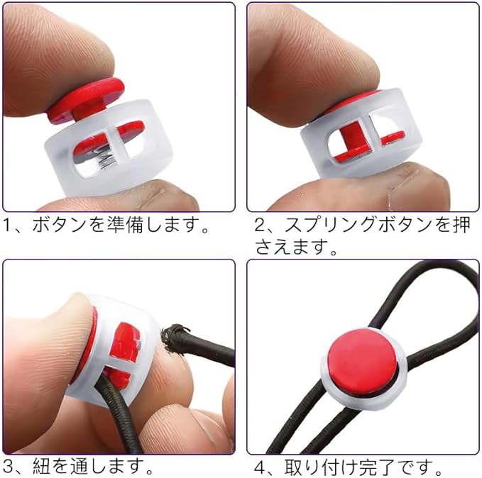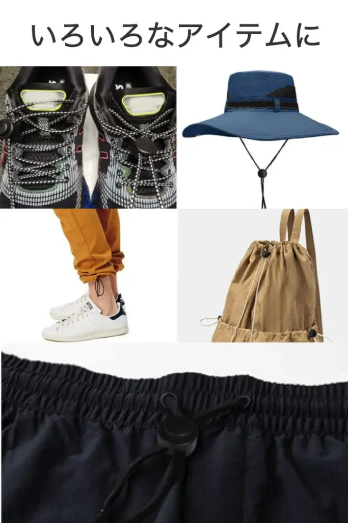 - 袋の口や靴紐に取り付けるだけで、結ぶことなく紐の長さを調整・固定できるので便利です。
