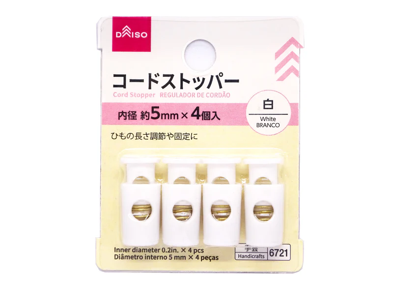 | 備考 | ・4個入り ・サイズ:1.1×2.7×1.1cm ・シンプル白でどんな紐にもマッチ | ・4個入り ・色:黒・白 ・袋物や衣類の紐どめに最適 | ・2個入り ・サイズ:9.5×7.5×1.5cm ・パーカーやナップサック等の紐調整向き |