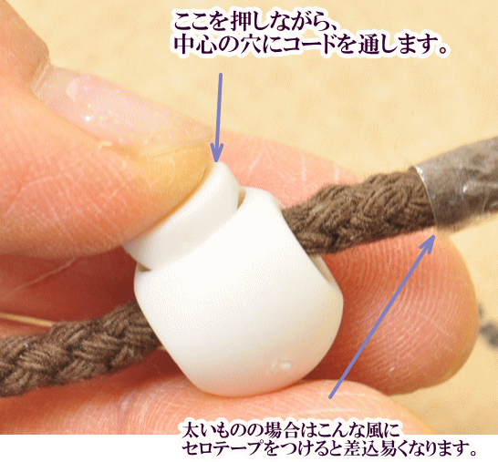 筒形なので紐が通しやすく、袋物、衣類の紐どめにぴったりですね。