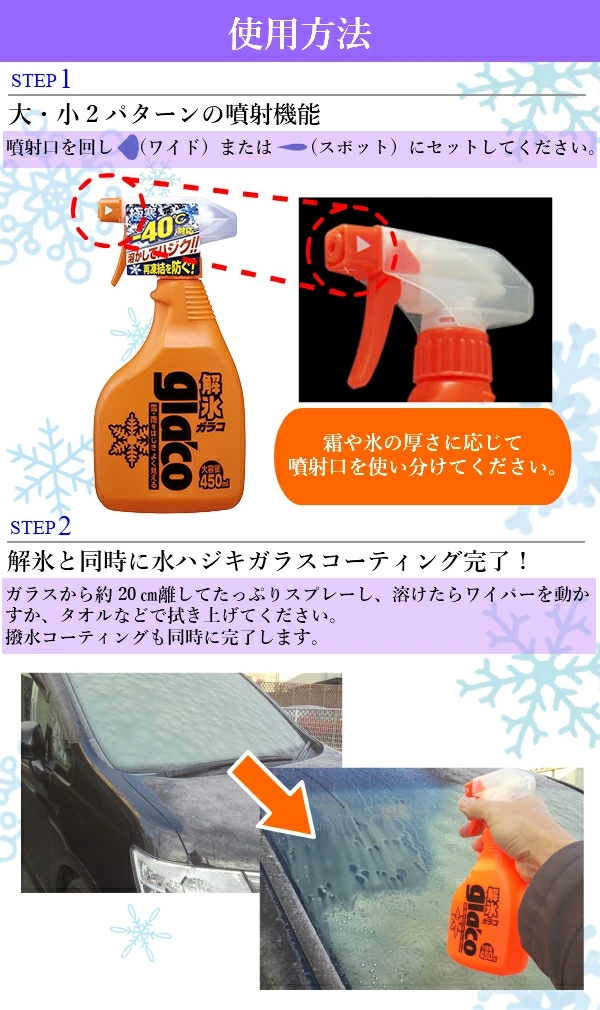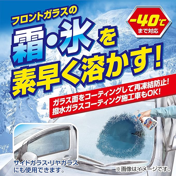- フロントガラスにスプレーをすると、瞬時に氷が溶けます。