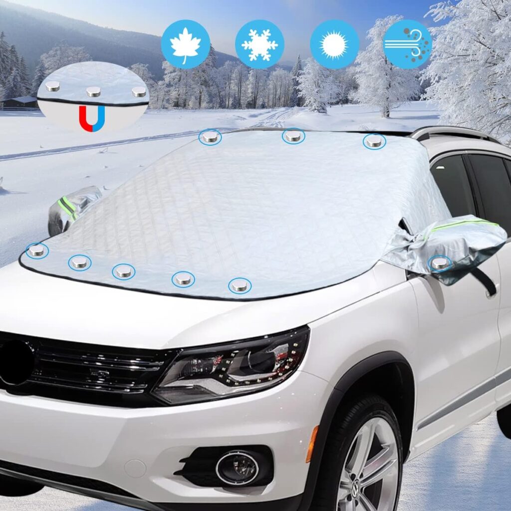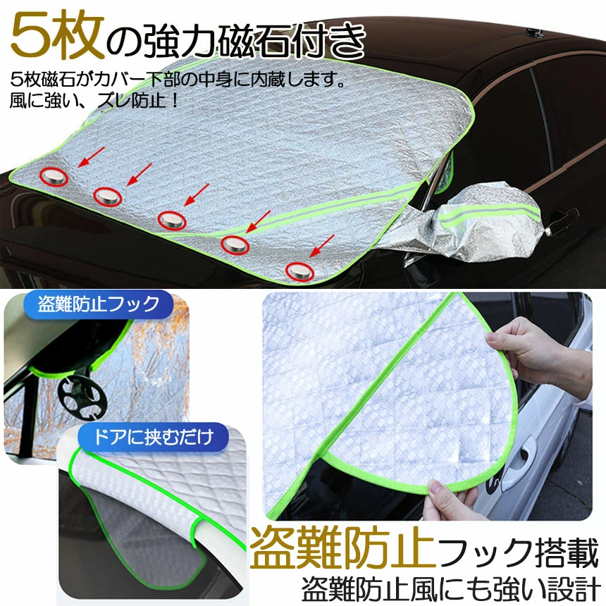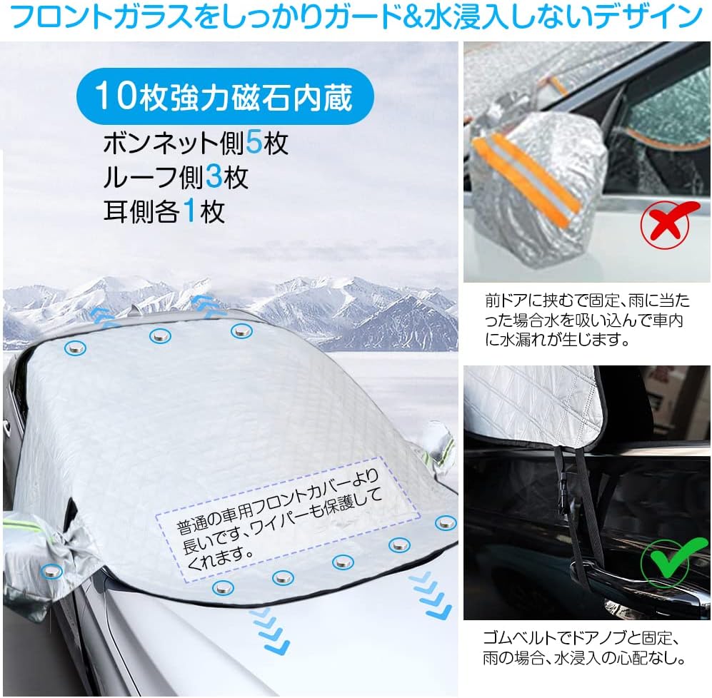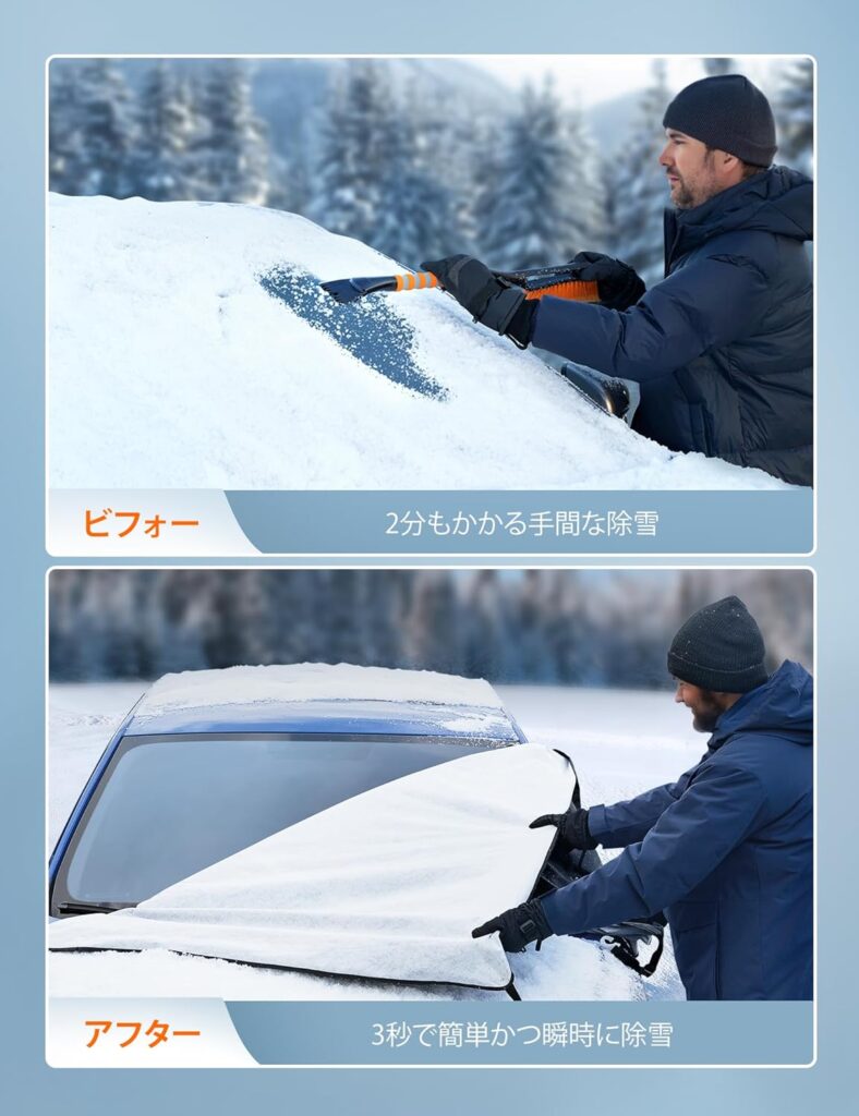 | SUPTEMPO 凍結防止カバー | ★4.0(300件) | M:約145×117cm/L:約155×129cm | 10枚磁石内蔵で強風でも外れにくい。盗難防止ベルト&ミラー保護カバー付き。 | Amazon/¥2,599 送料無料 |
