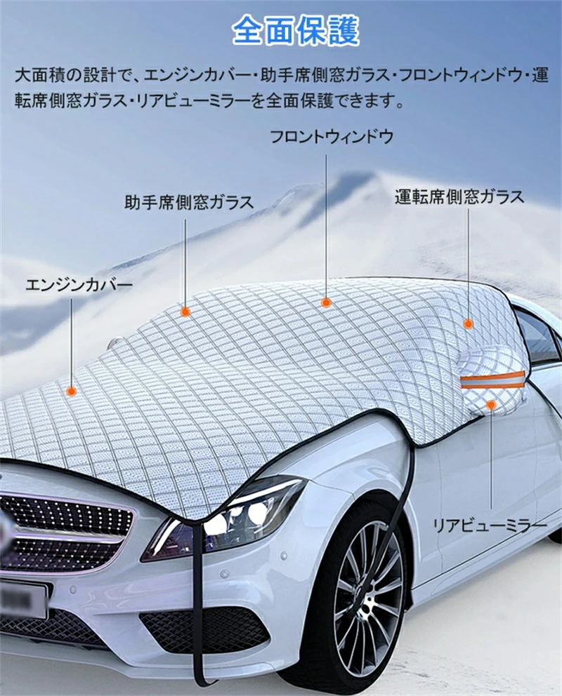 - 大面積の設計で、エンジンカバー・助手席側窓ガラス・フロントウィンドウ・ 運転席側窓ガラス・リアビューミラーを全面保護できます。