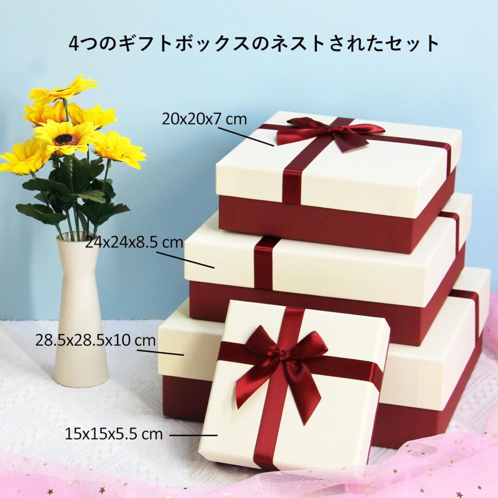 | Eerbaier ギフトボックスセット | ★4.1 | 大:28.5x28.5 x10 2 番目に大きい: 24x24x8.5 中:20x20x7 小さい:15x15 x 5.5 | ・大小4個セット ・厚紙補強、きめ細かい仕上げ紙、上質リボン付き ・組み立て済み | Amazon | 3,199円 | 無料 |