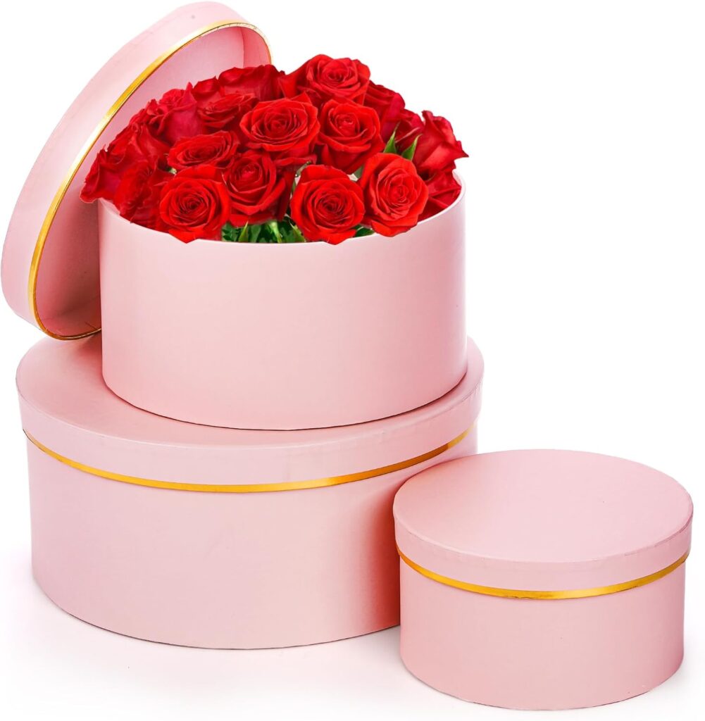 | Coloch 蓋付き丸型ギフトボックス | ★4.4 | S、M、Lの3個セット | ・金縁がアクセントの丸型 ・頑丈で変形しにくい厚紙 ・ピンク色で高級感あり | Amazon | 1,969円 | 595円 |