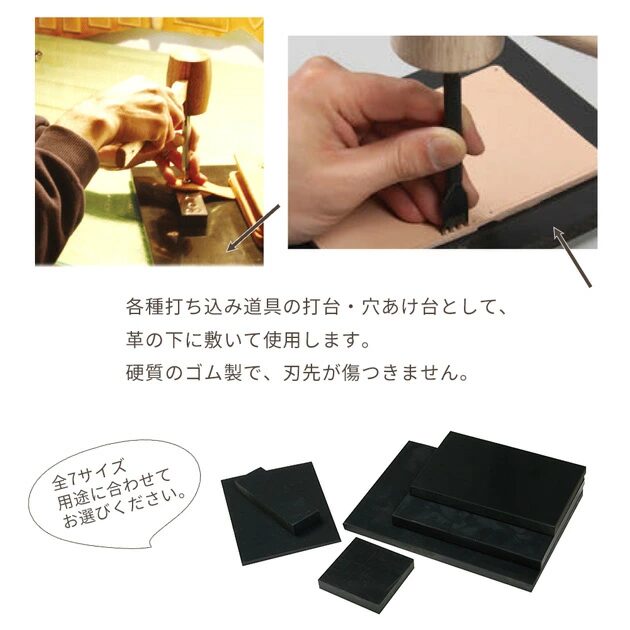 - 主な用途は各種打ち込み道具の打台、穴あけ台として、革の下に敷いて使用します。