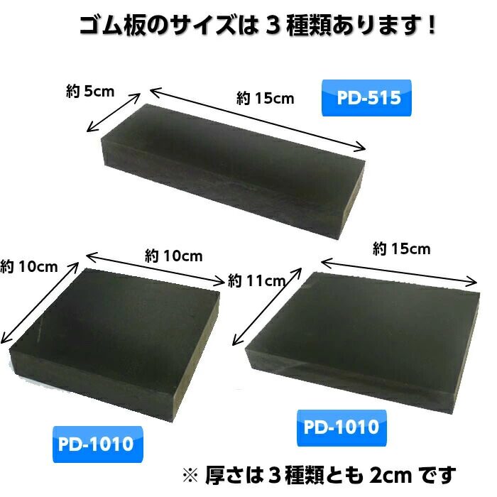 - ゴム板のサイズは3種類あります。(5cm×15cm、10cm×10cm、15cm×11cm)