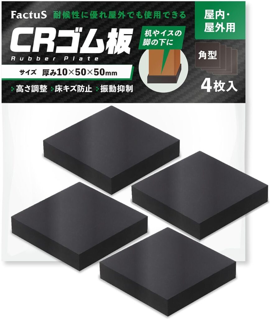 | 特徴 | 5×5×0.3cm。1枚で耐荷重15kg。カット可能。 | ゴム板としての販売はなし。 | 12×12×0.3cm。振動緩和・防振用。カット可能。 |
