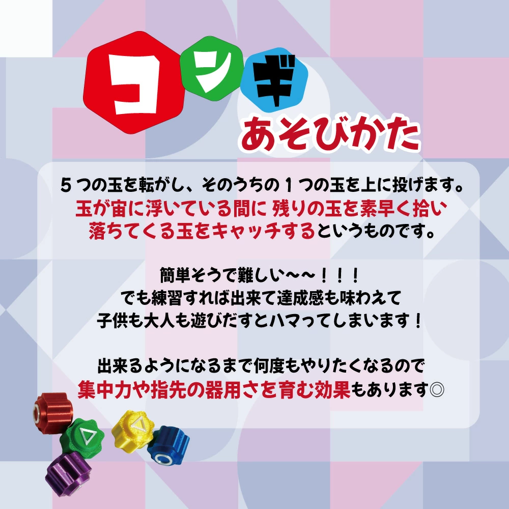 小さな五つの石を使う韓国の伝統的なゲームで、対象年齢は6歳以上となっています。