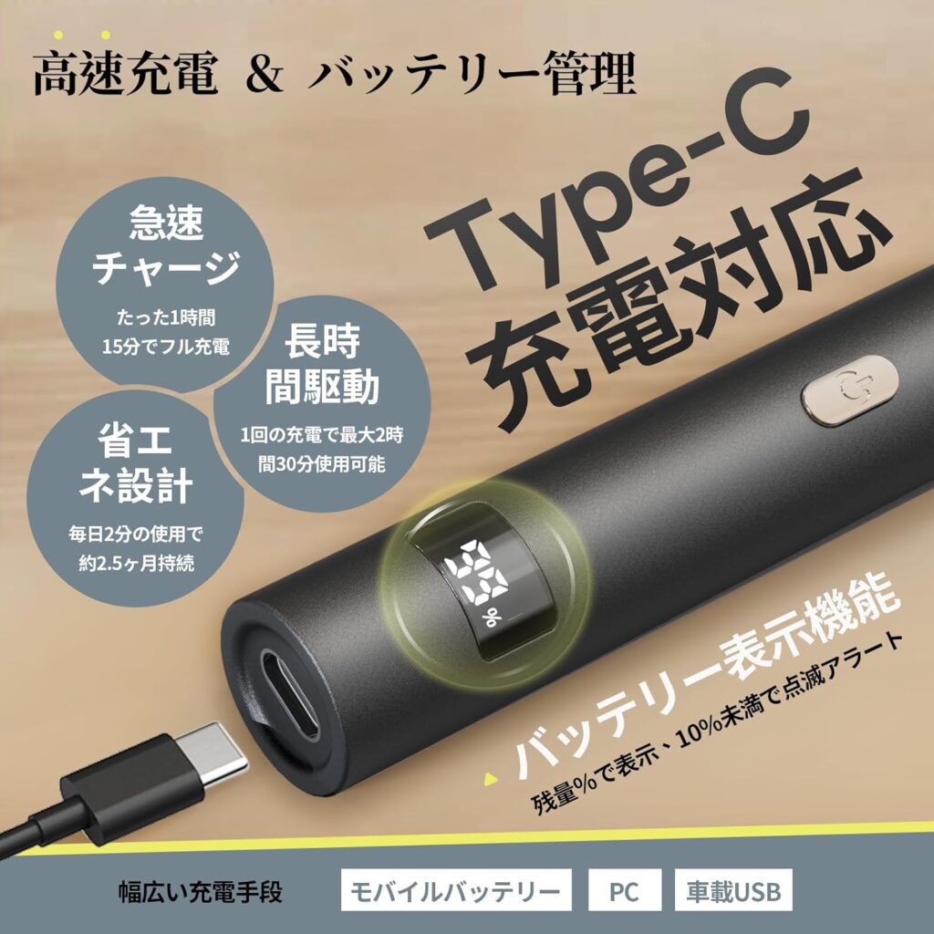 • 充電式(Type-C)で約1時間の充電で80%まで高速チャージができます。