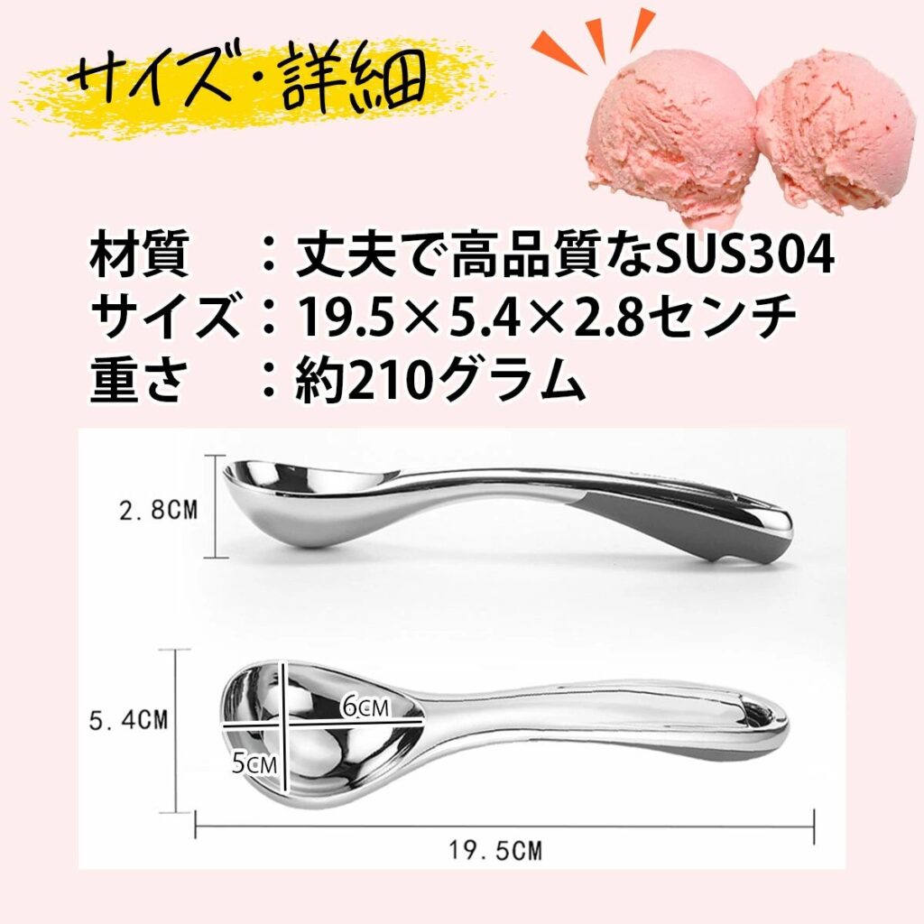 | TJ POP アイスクリームディッシャー | ★4.3(口コミ960件) | 約 長さ21.8×幅6cm | バネ式ハンドルで滑りにくく持ちやすい。耐久性の高いステンレス製で左右どちらの手でも使える | Amazon / ¥2,580 送料:無料 |