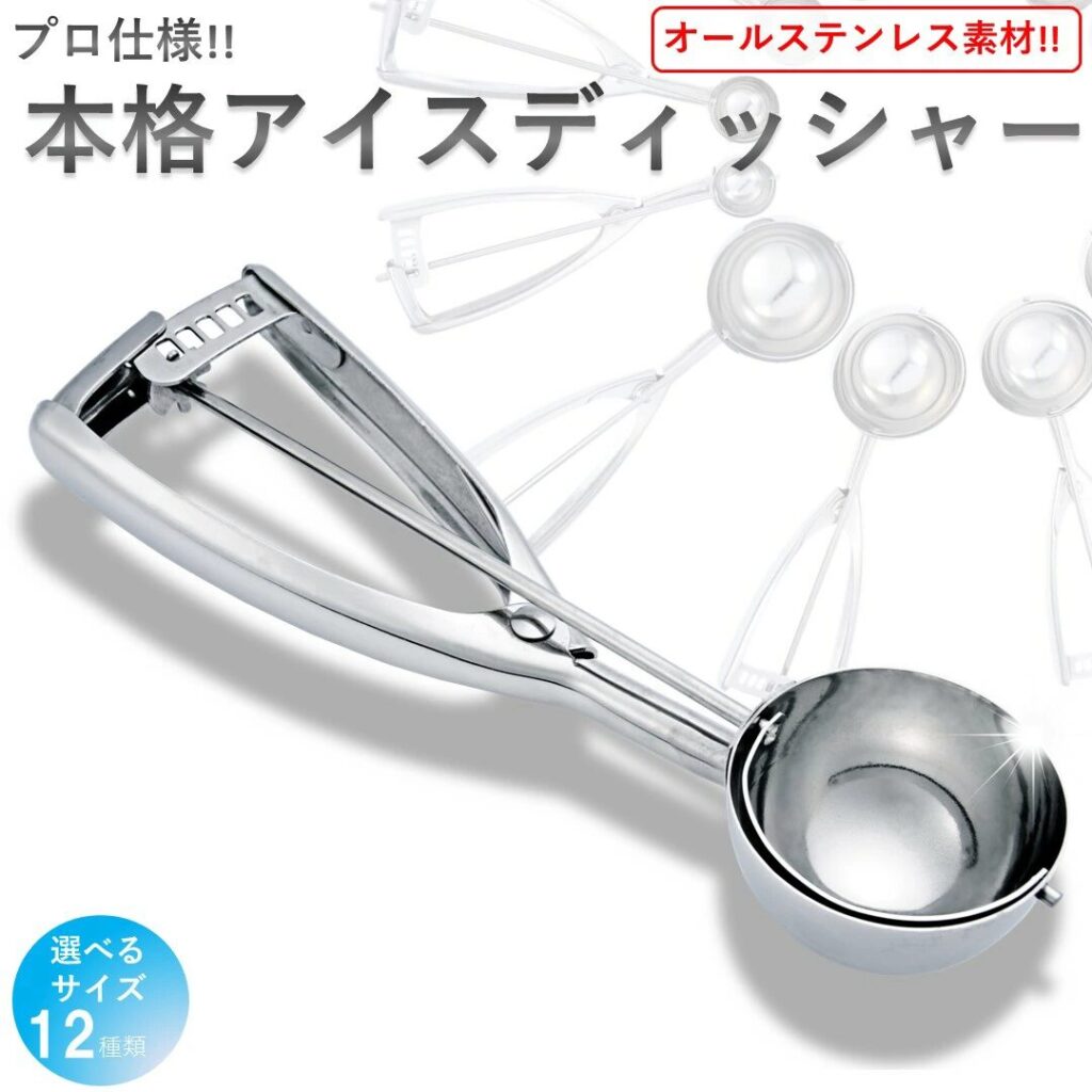 | 遠藤商事 アイスクリームディッシャー | ★4.2(口コミ1,186件) | 全長22.7cm / 容量85cc(10cc〜100ccサイズあり) | ミラー仕上げの光沢デザイン。耐久性の高いステンレス製で、アイスやポテトサラダなど多用途に使用可能 | Amazon / ¥1,871〜 送料:無料 |