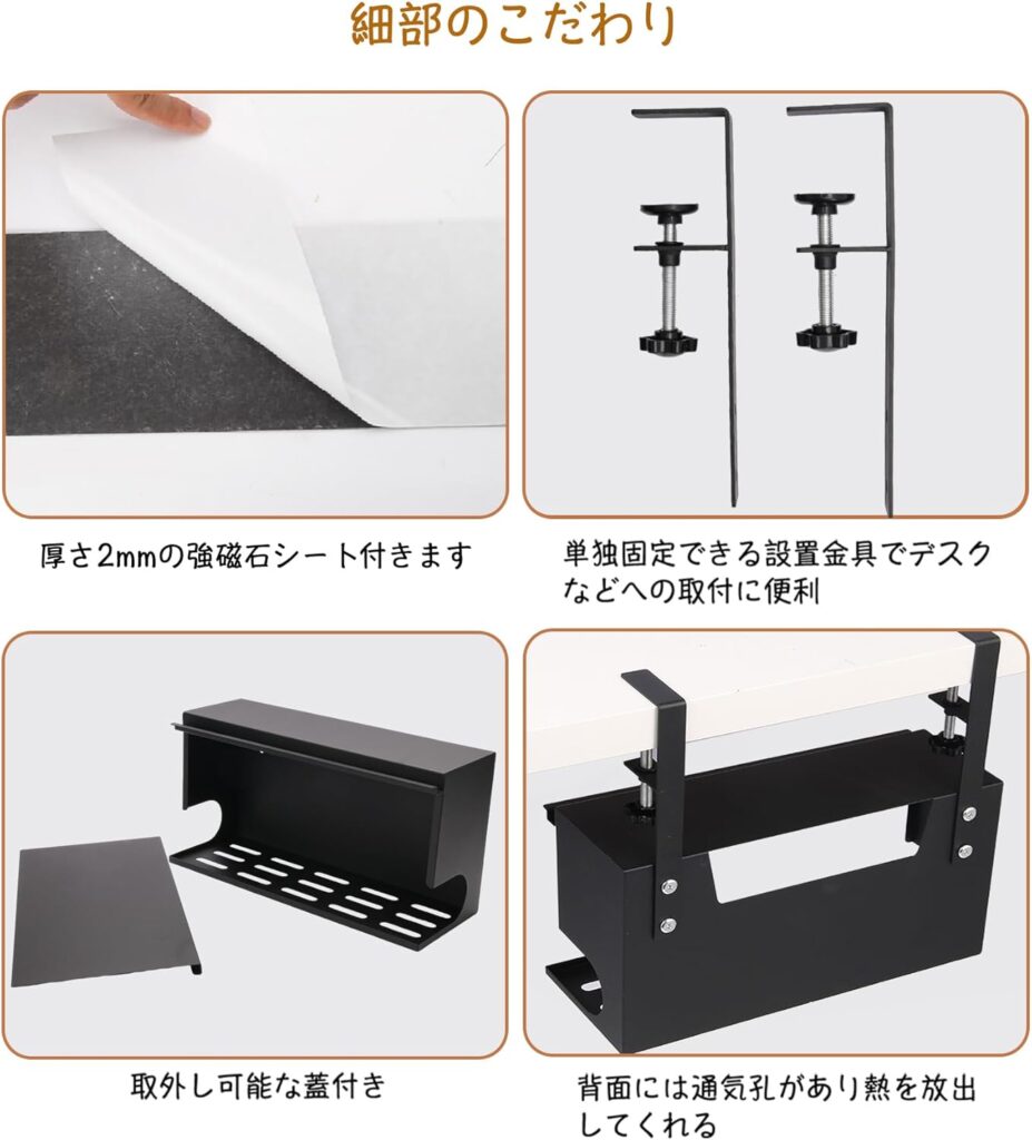 | foxeot ケーブルボックス | ★4.4(口コミ50件) | 長さ32cm と 55cm素材:スチール合金鋼板 | ・マグネット式 or クランプ式の2WAY・フロントカバー付きでホコリ防止・デスク下・壁面など多用途 | Amazon価格:※記載なし送料:無料 |