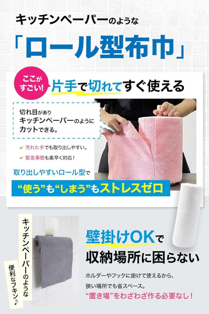 乾拭き・水拭き両用で、約20cmごとにミシン目が入ったキッチン向けロールタイプ。