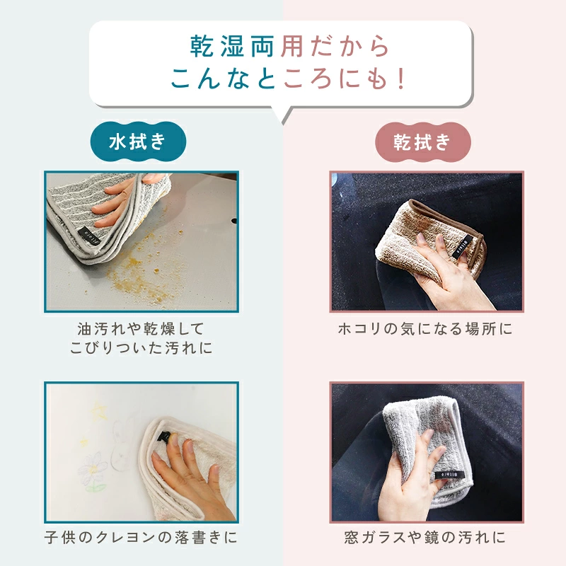 • 乾き拭き・水拭きどちらでも使え、繊維が密で水分をよく吸収するため乾きやすく、速乾性で雑菌の繁殖やいやな臭いも付きにくいです。
