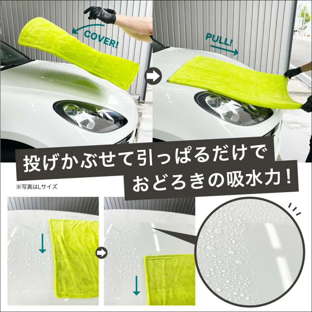 • 洗車後の濡れたボディに、サッと投げ被せて引っ張るだけで、水を一滴も残さずに拭き取ることができます。