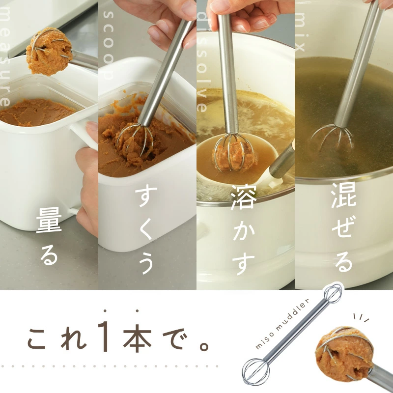 ののじ みそマドラー | ★4.4(597件) | 約19×4×2.5cm | ワイヤースプーン仕様で味噌が落ちやすい、泡立て器×スプーンの融合、多用途 | Amazon/送料無料 |