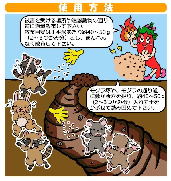 • 通り道や被害箇所に撒く、穴に入れるなど用途に応じた使い方が可能。