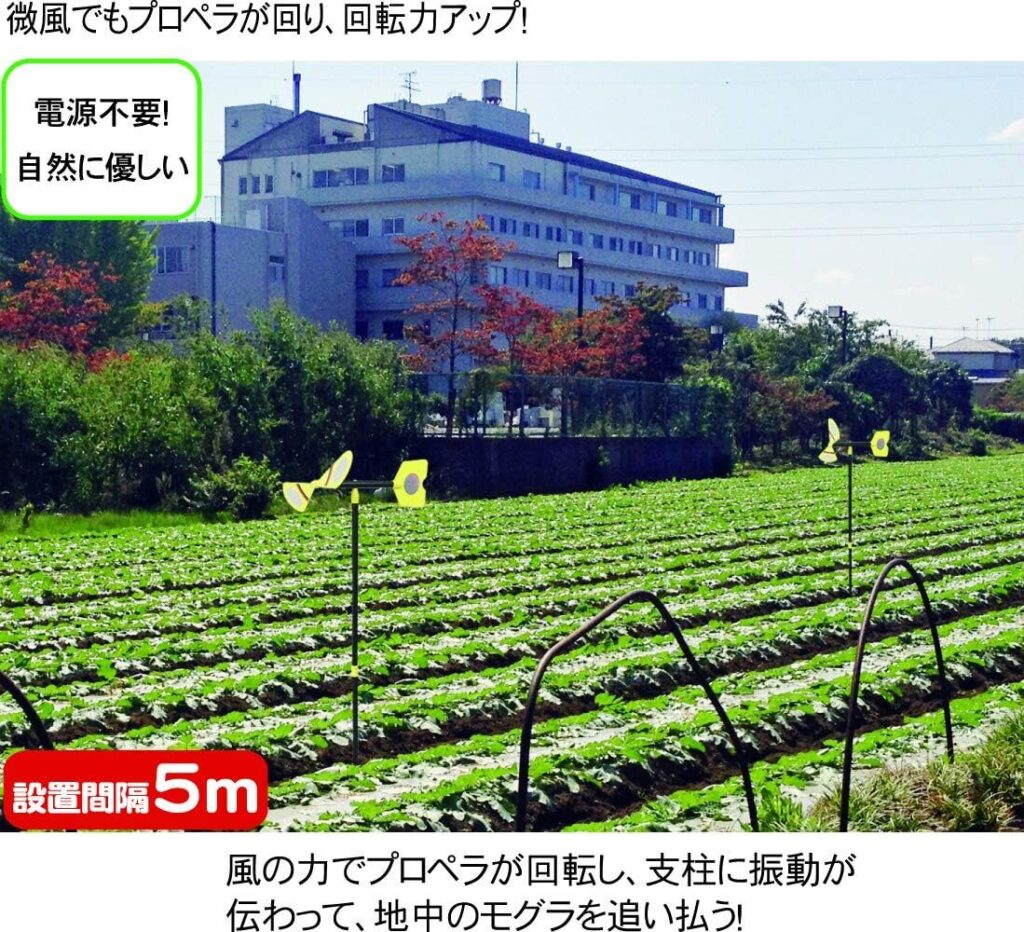 • 風の力でプロペラが回転し、地面に振動を与えてモグラを忌避する。