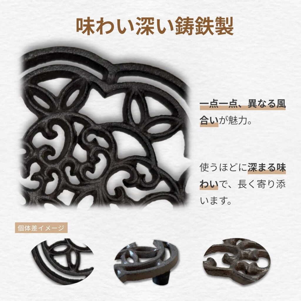 | tatiuh 鍋敷き | ★5.0(14件) | 19.5×19.5×2cm | ・鋳鉄製で高い安定性・三点脚構造・高温でも変形しにくい | Amazon | 約2,000円前後 | 無料 |