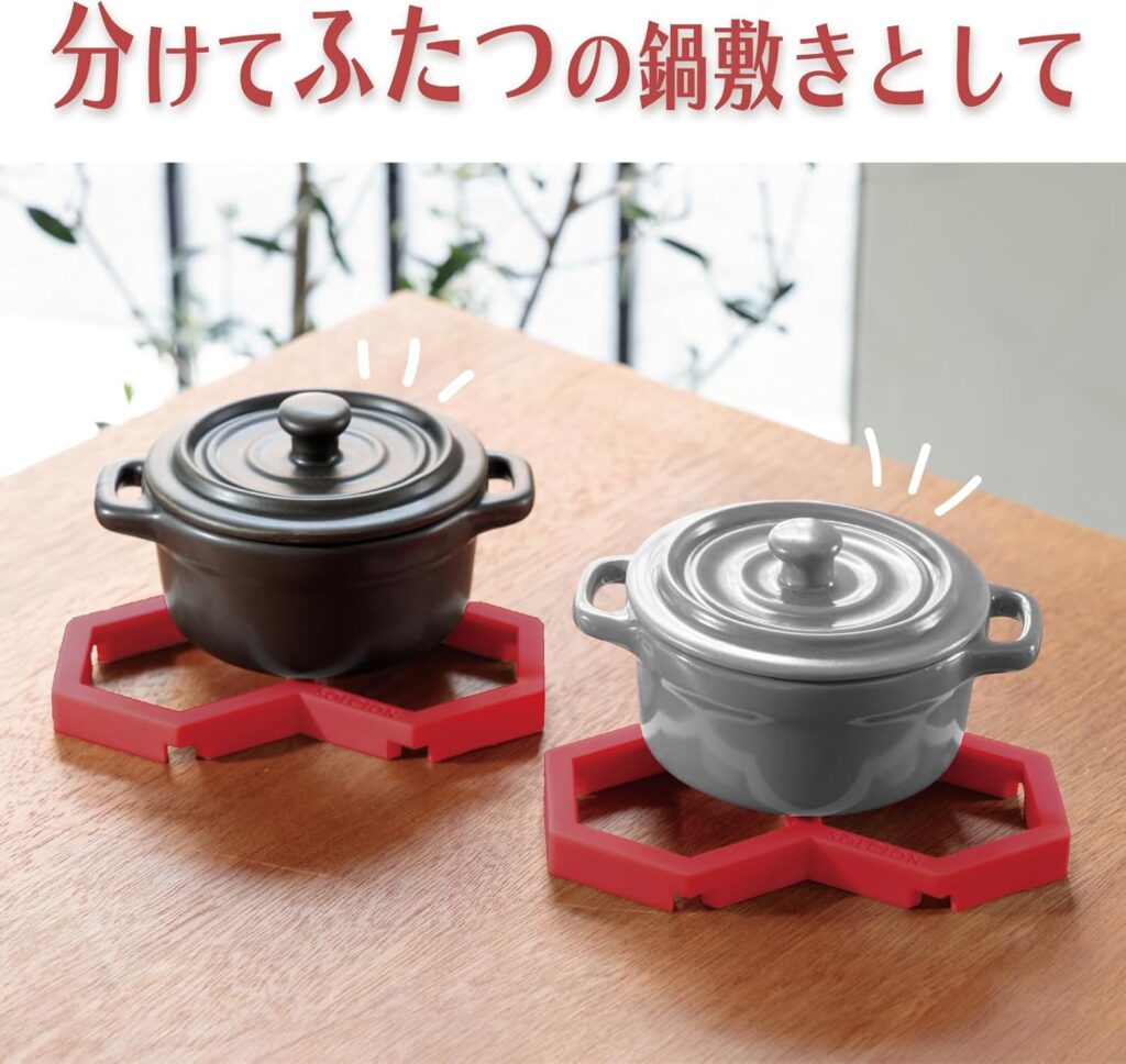 「そのままでも、2つに分けても使えるシリコン製鍋敷き」をお探しなら、「SOLCION 2つに分かれる鍋敷き」がオススメですね。