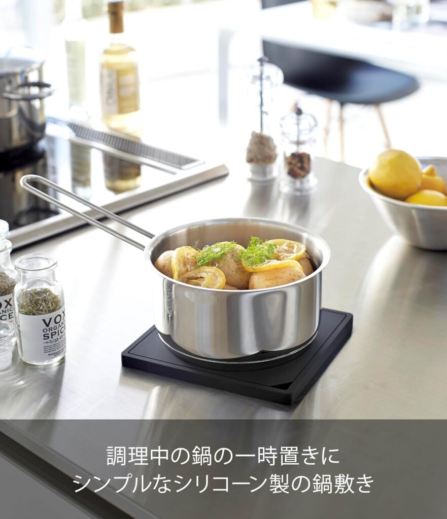 「シンプルでスタイリッシュな角形デザイン」の鍋敷きをお探しなら、「山崎実業 シリコン鍋敷き」がオススメですね。