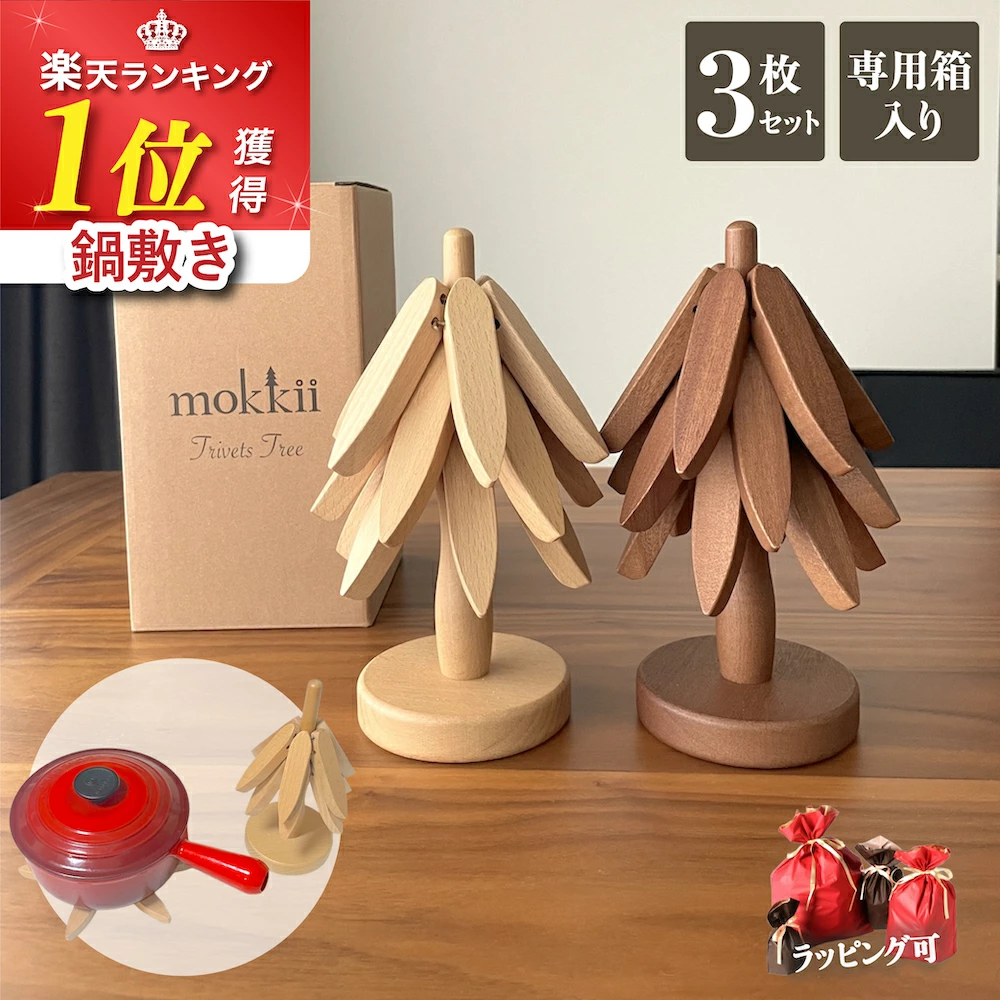 | MOKKII ツリー型鍋敷き | ★4.89(9件) | 使用時:直径約20cm×厚さ1.3cm収納時:直径約13.5cm×高さ22.5cm | ・北欧風ツリー型・天然木(ビーチウッド、エボニー)・3枚セット | 楽天市場 | 約3,000円前後 | 無料 |
